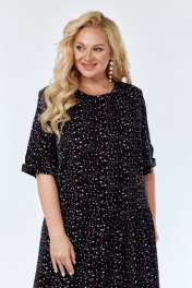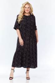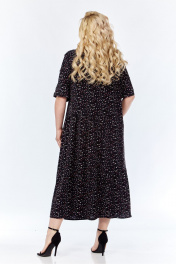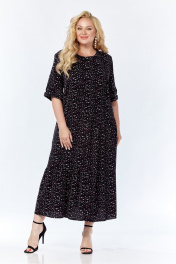 Силуэт полуприлегающий, расширенный к низу. Рукава втачные, двухшовные, внизу на манжетах. Внизу передних швов рукавов выполнены разрезы. Длина рукавов 34 см. Горловина закруглённая, на обтачке, которая закреплена отделочной строчкой. Перед с нагрудными вытачками. От правого плеча переда, вниз идёт один скошенный рельеф. На спинке также от правого плеча вниз идёт один скошенный рельеф. На левой части платья (спереди и сзади) внизу выполнен подрез, к которому пришита оборка со сборкой. На правой части платья (спереди и сзади) ниже уровня талии выполнен подрез, к которому пришита нижняя часть платья со сборкой. В боковых швах платья, на уровне линии бёдер, выполнены потайные карманы. Длина платья по спинке 126см. Платье выполнено из лёгкой плательной ткани. Обмеры 70 размера – ПОГ 73, ПОБ 96, длина по спинке 126, длина рукава 34.