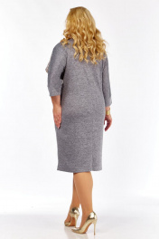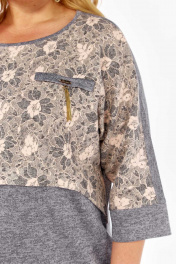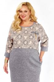Силуэт полуприлегающий. Рукав цельнокроеный, «летучая мышь». Низ рукава на манжетах. Длина рукава от горловины 52см. Горловина платья закруглённой формы, оформлена отрезной бейкой. Перед состоит из двух частей, изготовленных их разного материала. Верхняя деталь переда выполнена из трикотажного полотна, стилизованного под гипюр. Соединение верхней и нижней частей переда имеет отлетной край. В верхней части переда, слева, расположен клапан, украшенный пришивными элементами. Спинка со средним швом. В боковых швах платья на уровне линии бёдер выполнены потайные карманы. Длина платья по спинке 104 см. 60 р. – ПОГ 63, ПОБ 65