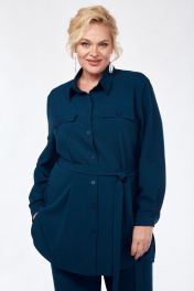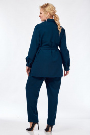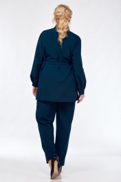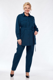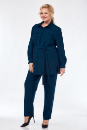Силуэт полуприлегающий. Рукава втачные, одношовные. Низ рукава со складками и на манжете с застёжкой на пуговицу. Рукав дополнительно может подворачиваться и фиксироваться патой с застёжкой на пуговицу. Длина рукава 58 см. Горловина с отложным воротником на стойке, рубашечного типа. Перед с нагрудными вытачками и со сквозной застёжкой на пуговицы. Вверху полочек настрочены клапаны, которые декорированы пуговицами. Внизу боковых швов выполнены разрезы. В комплекте с блузкой идёт пояс. Длина блузки по спинке 78 см. Брюки прилегающие, спереди на молнии. Посадка стандартная. Пояс с резинкой по бокам. Длина брюк по боковому шву (с учётом пояса) 106 см. Комплект выполнен из костюмно-плательной ткани. Верх 60 р.- ПОГ 66, ПОБ 68. Низ 60 р – ПОТ 49, ПОБ 64