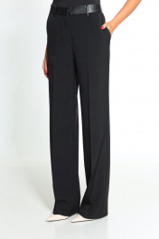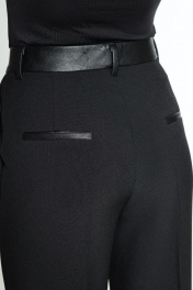 Стильный брючный костюм. Стильный женский жакет современного прямого силуэта, на подкладке. Воротник пиджачного типа с отложным лацканом, нижний воротник из отделочной ткани - эко-кожи. Спереди прорезные карманы в рамку. Спинка со средним швом и высокой отлетной шлицей ( 39см ). Рукав втачной, двухшовный, по переднему шву с открытой шлицей. Брюки прямого силуэта, с заутюженными стрелками. Пояс брюк стабильный,выполнен из отделочного материала - эко-кожи, по поясу нашиты шлевки. Застежка-гульфик, по переду боковые наклонные карманы. Длина жакета по среднему шву спинки 77см. Длина рукава 62 см. Длина брюк по боковому шву с поясом 111 см. Ширина брюк по низу 24 см.
