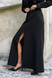 Стильный костюм с юбкой. Трендовый, укороченный кроп-жакет на подкладке. Полочка с нагрудной вытачкой, спинка со средним швом и отрезными бочками. Воротник пиджачного типа с отложным лацканом, на левой полочке листочка. Рукав втачной, двухшовный, на левой стороне настрочена декоративная нашивка. Актуальная юбка-макси, расклешенного силуэта к низу, с разрезом впереди. Застежка - потайная молния в среднем шве задней части юбки. Пояс стабильный с настроченными шлевками. Длина юбки по боковому шву с поясом 101 см. Модный женский костюм - выбор тех, кто стремится выглядеть презентабельно в любой ситуации. Длина жакета по среднему шву спинки 39,5 см. Длина рукава 61 см.