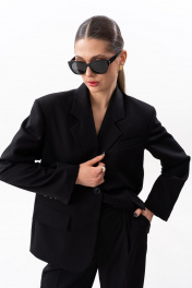 Жакет прямого силуэта, с увеличенной линией плеч, с отрезным бочком, на левой полочке листочка. Жакет на поливискозной подкладке. Спереди прорезные карманы с клапаном. Спинка со средним швом, отрезным бочком. Воротник пиджачного типа с отложным лацканом. Рукав втачной, двухшовный, со шлицей и пуговицами. Длина жакета по среднему шву спинки 68 см. Длина рукава от удлиненного плеча 60 см. Параметры жакета в готовом виде в 44 размере: Ширина изделия на уровне глубины проймы 106 см, ширина на уровне линии талии 103 см, ширина изделия на уровне линии бедер 106 см. Ширина рукава по низу 32 см. На фото: брюки S-3628, брюки S-3630, юбка S-4619