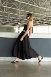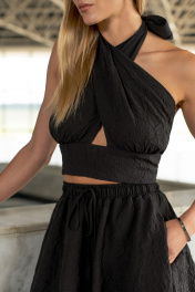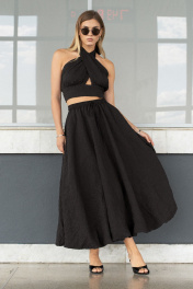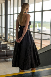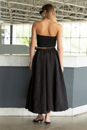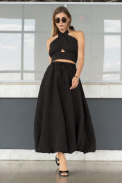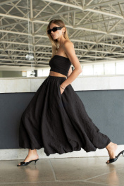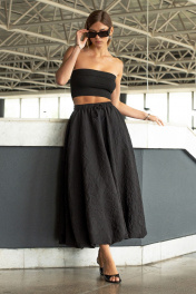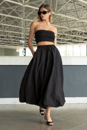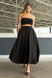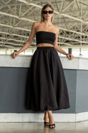 Стильная юбка баллон на хлопковой подкладке из эффектной "жатой" вискозы. Силуэт А-образный, отрезной пояс на резинке с кулисой. В боковых швах карманы. Длина юбки с поясом по боковому шву 93 см.