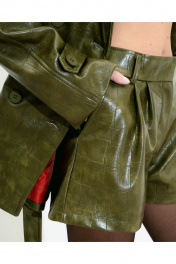 Шорты из экокожи стеснение под крокодиловую кожу. Насыщенный оливковый цвет. Пуговица на поясе в тон ткани а также шлевки на поясе. Шорты с спортивными карманами и складками. Длина 36 см. Ширина на уровне талии: S - 72 см, M - 76 см, L - 80 см. Ширина на уровне бедер: S - 94 см , M - 100 см, L - 106 см.