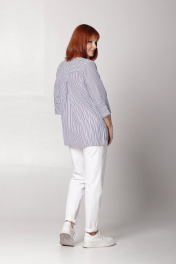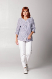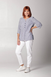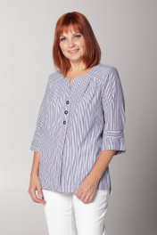Блуза женская прямого силуэта. Перед с отрезными кокетками и складками в области груди. Центральная застежка на петли и пуговицы: три пуговицы потайные, три - лицевые. Спинка с отрезной кокеткой и встречной складкой по центру. Перед укорочен по отношению к спинке на 3 см. В боковых швах - разрезы. Рукав втачной, с плечевыми накладками. По низу рукава подрез со складками. Длина рукава - 43 см. Длина изделия по спинке: размер 48 - 69 см; размер 50 - 70 см; размер 52 - 71 см; размеры 54, 56 - 72 см.