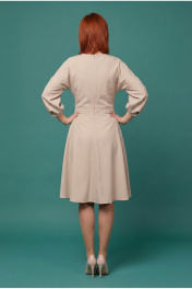 Платье женское полуприлегающего силуэта, отрезное по линии талии. Юбка- клёш. Лиф - летучая мышь. В среднем шве спинки обработана застёжка на потайную молнию. По линии талии обработана кулиса с поясом. По низу рукава складки и притачная манжета. Нижняя часть рукава на подкладке. Длина рукава по плечевому шву с манжетой- 57 см, длина платья от линии талии - 64 см.