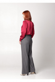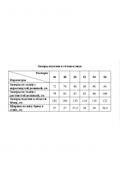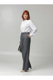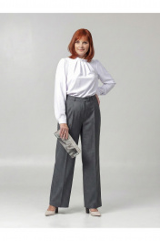 Брюки женские, прямые от колена. По переду карманы с наклонным входом и две вытачки. Спинка с талевой вытачкой. Застёжка на молнию. Верхний срез обработан притачным поясом + шлёвки. Пояс в области спинки с резинкой. Средняя длина по боковому шву без пояса - 106 см.