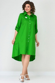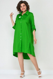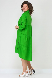 Платье женское, выполненное из хлопковой ткани. Полочка с нагрудной косой вытачкой. Воротник рубашечного типа. Рукав втачной, длина регулируется патой. Застежка-планка на пуговицах. Платье без подкладки. Спинка отрезная по линии талии и декорирована складкой. Юбка состоит из воланов со средней сборкой. В боковых швах имеются карманы. Украшением платья служат пришивные эмблемы и разного цвета пуговицы