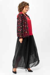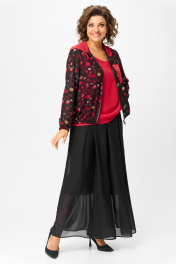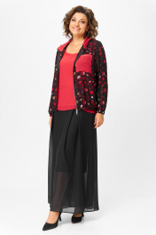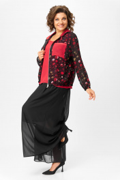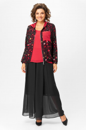 Комплект состоит из накидки на молнии, юбки-брюк (кюлоты) и топа из шифоновой ткани. В накидке по переду вставлена молния. На спинке капюшон. Рукав втачной длинный с манжетой из резинки на конце. Низ тоже заканчивается манжетой. Кюлоты из однотонной ткани на притачном поясе по бокам со вставкой резинкой. Застежка потайная молния и 2 пуговицы. По переду брюк три бантовых складки, а по спинке две. Кюлоты подкладке. Длина брюк 7/8. По боковому шву в 48 размере длина брюк 103 см. ВНИМАНИЕ! Деликатная стирка при 30 градусах!