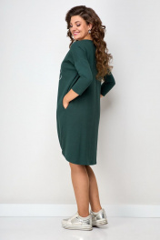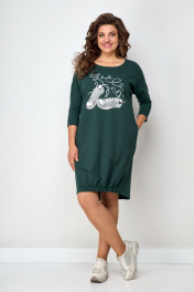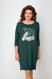 Платье свободного силуэта со спущенным рукавом. Горловина округлая. Рукав ¾. По низу боковой шов смещенный. Спинка переходит на переднюю часть полочки, за счет этого визуально уменьшается размер и фигура кажется стройнее. Низ полочки на широком (3см) резинке, платье не кажется объемным, на ширину шага не влияет. Украшением платья служит термо-печать.Длина по переду в 50-52-96см, по спинке-108см, по переду в 54-58-100см, по спинке-112см.