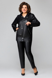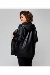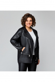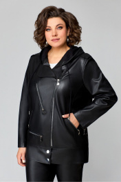 Куртка женская из эко - кожи прямого силуэта, слегка зауженная к низу. Застежка ассиметричная на молнию с лацканами. Горловина с капюшоном на кулисе. По переду два прорезных кармана на молнии и две декоративные молнии. Боковая деталь переходит в рельефы по переду и спинке. По низу куртки притачной пояс с застежкой на две петли и пуговицы. По спинке кокетка. Рукав втачной длинный, двухшовный с застежкой молнией по низу. Нижние срезы куртки, кокетки, срезы рельефов и рукавов не обработаны. Куртка без подкладки. Фурнитура может меняться от наличия. Длина середины спинки: 76 см Длина рукава: 60 см