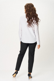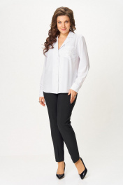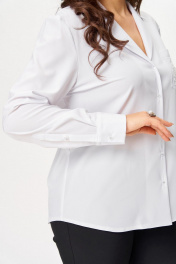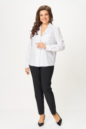 Блузка женская из хлопковой ткани, прямого силуэта с втачным рукавом. Линия плеча слегка спущена. Застежка центральная на петли и пуговицы. Воротник отложной с лацканами. Перед с вытачками по линии груди. По левой части переда накладной карман с отделкой. Рукав длинный рубашечный, по низу притачная манжета с застежкой петли и пуговицы. Линия низа фигурная. Фурнитура может меняться от наличия. Длина блузки по спинке: 65 см Длина рукава от горловины: 75 см