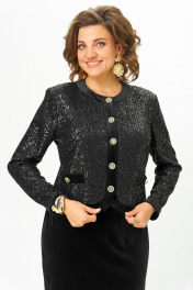 Костюм женский двухпредметный состоящий из жакета и юбки. Жакет в стиле «Шанель» полуприлегающего силуэта с втачным рукавом, на трикотажной подкладке. Горловина округлой формы. Застежка центральная на пять обметанных петель и пять акцентных пуговиц. Перед с вытачками по линии груди, в нижней части декоративные карманы. По горловине, краю борта, низу жакета и рукавов отрезная планка. Юбка женская, длиной за колено, слегка заужена к низу. Верх на притачном поясе с эластичной тесьмой. Длина жакета по спинке: 50 см Длина рукава: 60 см Длина юбки: 93 см