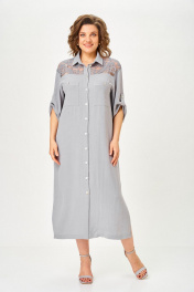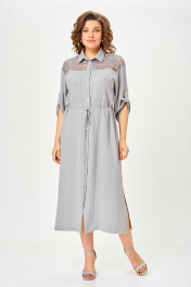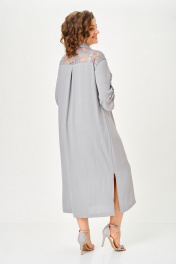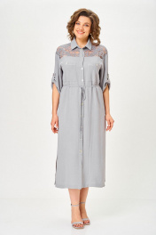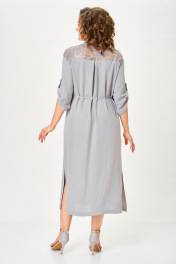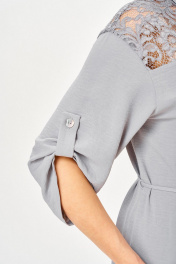 Платье женское в стиле сафари прямого силуэта с декором из кружева. Втачные рукава длиной ¾, по низу регулируются патой. Линия плеча спущена. Застежка центральная на петли и пуговицы. Воротник отложной на стойке. Нижняя часть спинки со складкой из-под кокетки. Верхняя часть переда с накладными карманами. В боковых швах разрезы. По линии талии съемный пояс в тон. Длина платья по спинке: 127 см Длина рукава от горловины: 58 см