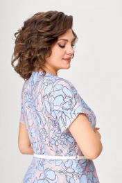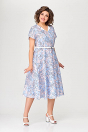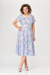 Платье А-силуэта, отрезное по линии талии. Платье - из струящейся принтованной плательной ткани. Перед лифа со средним швом и отложным цельнокроеным воротничком, выполненным из контрастной однотонной хлопковой ткани. По переду и спинке лифа расположены рельефы. В среднем шве спинки предусмотрена молния. Рукав втачной короткий формы «тюльпан». В комплект входит декоративный ремень, шириной 1,4 см. ( в зависимости от партии ремень (пряжка) может меняться). Длина платья по спинке 115см (+/ - 1см) Длина рукава 20см (+/ - 1см)