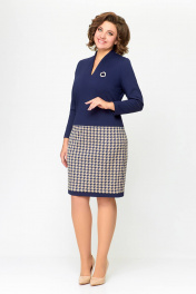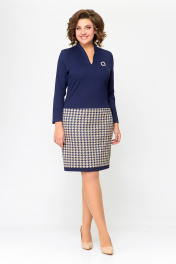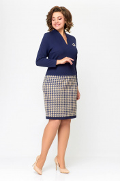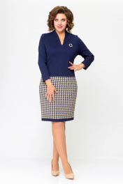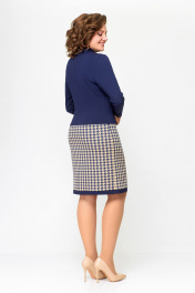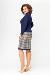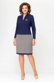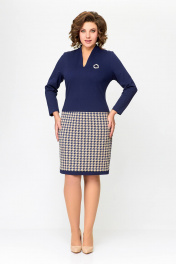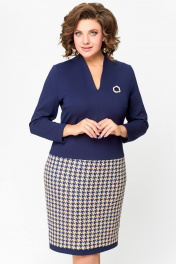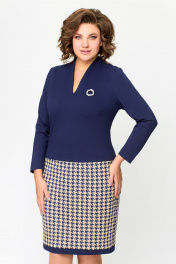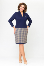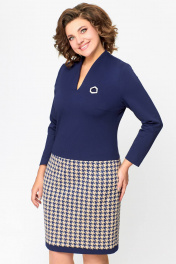 Платье женское полуприлегающего силуэта из эластичного трикотажного полотна. Платье отрезное ниже линии талии. Верхняя часть выполнена из однотонного полотна, нижняя часть – с дизайном «гусиная лапка». Передняя часть лифа со средним швом и нагрудными вытачками. Спинка лифа со средним швом и талиевыми вытачками. По горловиле спинки обработана притачная стойка высотой 3 см, плавно переходящая в V-образный вырез по переду, обработанный обтачкой. Передняя и задняя части юбки цельнокроеные с отрезной планкой по низу из однотонной ткани шириной 3 см. Длина изделия 48,50,52 размер - 98 см. (±1 см). Длина изделия 54,56,58 размер - 100 см. (±1 см). В комплект входит декоративное украшение-брошь. В зависимости от партии украшение может меняться.