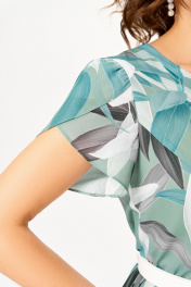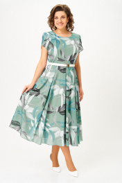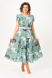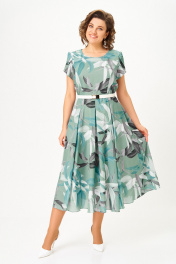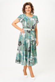 Платье из шифона на трикотажной подкладке, Х-образного силуэта с полуприлегающим лифом. Платье отрезное по линии талии. По переду лифа расположены рельефы, по спинке лифа талиевые выточки. Юбка расклешенная из шести клиньев со встречными складками по линии талии. В среднем шве спинки предусмотрена потайная тесьма- молния. Рукав втачной покроя тюльпан, длина рукава 15 см. В подарок ремень с декоративной пряжкой. Размер 64 комплектуется поясом из основной ткани. Длина изделия по спинке 120 см