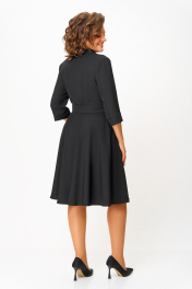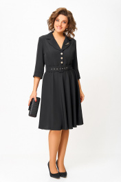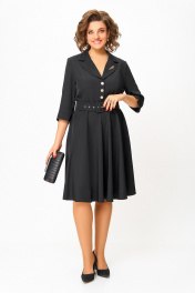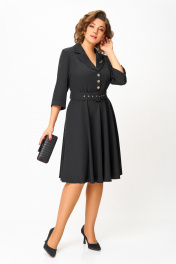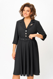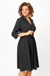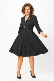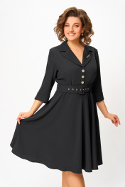 Платье из мягкой поливискозной ткани, Х-образного силуэта с полуприлегающим лифом. Платье отрезное по линии талии. Перед лифа с вертикальными рельефами и застёжкой на петли и 4 декоративные пуговицы. Горловина V-образной формы, с отложными лацканами и воротником пиджачного типа. Спинка лифа с талиевыми выточками. Рукав втачной, длиной ¾, по низу манжет с разрезом. Застёжка в боковом шве на потайную тесьму-молнию. В комплекте пояс из основной ткани с пряжкой и блочками. В подарок декоративное украшение – брошь. Длина рукава – 43 см. Длина изделия по спинке – 101 см. (+/-1 см.)