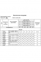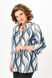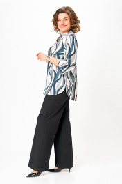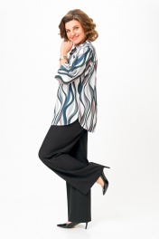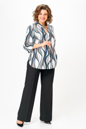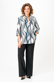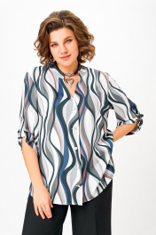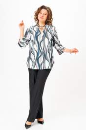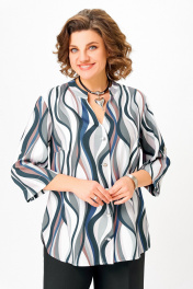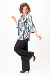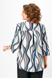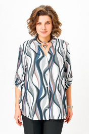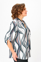 Блузка из мягкой вискозной ткани, свободного силуэта с центральной застёжкой на петли и декоративные пуговицы. Перед с нагрудными вытачками. Спинка с отрезной кокеткой и бантовой складкой. Горловина V-образной формы с притачной стойкой. Рукав втачной, одношовный, прямой длиной ¾ с патой и пуговицей, которыми регулируется длина. Низ полочки и спинки закруглённой формы с разрезами по боковым швам. Длина по центру спинки в размерах 52.54,56 – 71 (+/-1) см. в размерах 58.60,62 – 74 (+/-1) см. Длина рукава – 44 см.