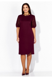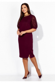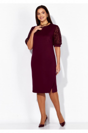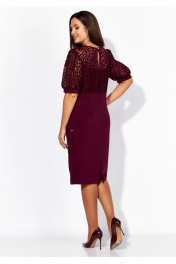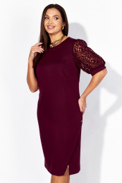 Платье женское, полуприлегающего силуэта с коротким рукавом. Рукав типа "фонарик" со сборкой сверху и снизу. По низу притачная манжета. По переду нагрудные вытачки. Горловина круглой формы. По низу асимметричная, отлетная планка с разрезом и декоративная нашивка. По спинке средний шов с разрезом снизу и талевые вытачки. Горизонтальный подрез выше линии талии. Верхняя часть спинки и рукав выполнены из ткани сетка с флоковым нанесением. Застежка на потайную "молнию"