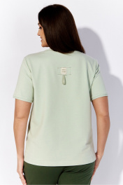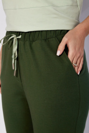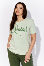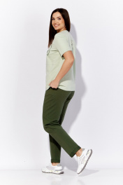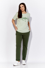 Комплект женский, 2х предметный, состоящий из футболки и брюк. Футболка прямого силуэта с коротким втачным рукавом. Вырез горловины круглой формы. По переду горизонтальный подрез. Верхняя часть задекорирована вышивкой. На спинке акцент в виде нашивки с элементом декоративной тесьмы. Брюки прямые, по низу с отворотом. По переду карманы и частичные защипы в области колена. Пояс притачной с резинкой по кругу и отделочной тесьмой спереди.