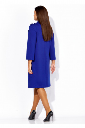 Платье женское, чуть А-силуэта, с втачным рукавом, длинной 7/8. По центу переда объемные , фигурные рельефы. Горловина оформлена небольшой мягкой стойкой. Декором служат съемные цветки-броши. По низу платья отделочная нашивка. Спинка со средним швом. Платье изготовлено из трикотажного полотна "тенсел".