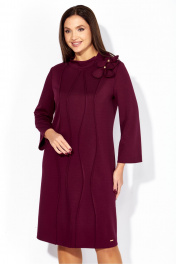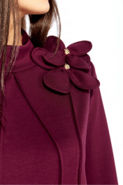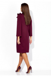 Платье женское, чуть А-силуэта, с втачным рукавом, длинной 7/8. По центу переда объемные , фигурные рельефы. Горловина оформлена небольшой мягкой стойкой. Декором служат съемные цветки-броши. По низу платья отделочная нашивка. Спинка со средним швом. Платье изготовлено из трикотажного полотна "тенсел".
