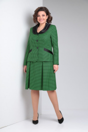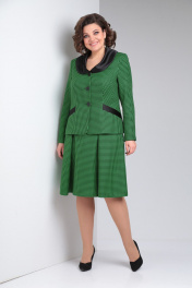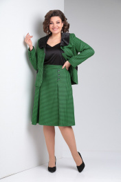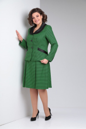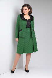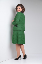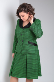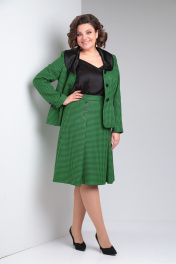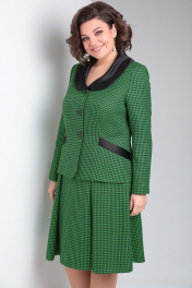 Костюм состоит из жакета и юбки. Жакет из костюмной ткани на подкладке, полуприлегающего силуэта, отложным воротником и центрально бортовой застежкой на петли и пуговицы. Перед с талиевыми вытачками, прорезными карманами с листочкой. Спинка со средним и рельефными швами. Рукав втачной двухшовный с имитацией шлицы. Воротник отложной, круглый. Длина по спинке 60. Длина рукава 62. Юбка из костюмной ткани без подкладки, слегка расширенная к низу с мягкими складками на переде, застежкой - «молнией», на поясе с застежкой на петли и пуговицы.