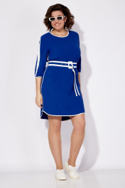 Современное женское платье, выполнено в спортивном стиле из легкой, тонкой плательной ткани. Силуэт свободный, прямой. Длина до середины бедра. Горловина округлая, окантована. Рукав втачной, по низу окантован, с небольшой сборкой. По верхней части рукава выполнена вставка из ткани компаньона. По боковому шву вставлен кант. Низ платья фигурный, спинка длиннее переда, окантован тканью контрастного цвета. К платью прилагается ремень, выполненный из ткани платья, с обтянутой пряжкой. Изделие отличается хорошей посадкой на фигуру любого типа, идеально в повседневной носке, ткань износостойка, не мнется. Длина платья по переду ок. 95 см Длина рукава ок. 41 см