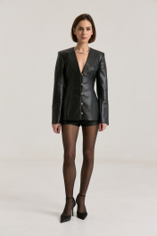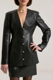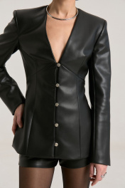 Жакет прилегающего силуэта с глубоким V-м вырезом, застежка центральная на навесные петли. Талия отрезная, полочка и спинка верхней части с выточками, нижняя часть полочки с выточками и рельефами. Жакет выполнен из мягкой экокожи черного цвета. Рукав втачной, двухшовный с плечевой накладкой. Жакет на подкладке. Такой жакет максимально подчеркнет линию талии, сделает образ притягательным и женственным. Жакет можно ность самостоятельно, с шортами или юбкой из нашей коллекции арт. 2451, арт. 2333, брюками арт. 2458, арт. 2457. Длина по спинке -65 см, рукав 63 см, полуобхват груди - 43 см, плечо - 13 см в 42-м размере.