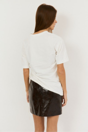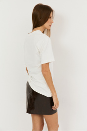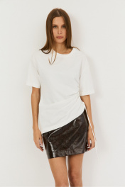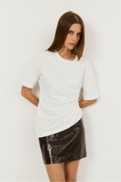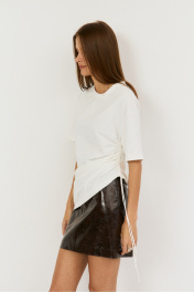 Удлиненная футболка на кулисе сбоку, с ее помощью можно менять силуэт от прямого до укороченного, регулируя самостоятельно, рукав втачной, линия плеча спущена, полуприлегающий силуэт. Выполнена из хлопковой ткани (кулирка) .Длина 65см сбоку, 22 см -длина рукава, полуобхват груди - 48 см.