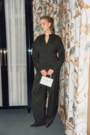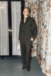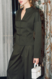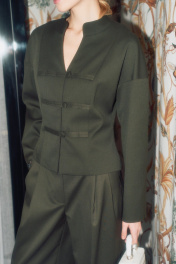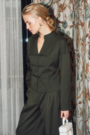Жакет полуприлегающего силуэта в азиатском стиле. Длина выше линии бедер, изделие на подкладке. По переду от линии плеча до низа изделия вертикальный рельеф. Застежка на навесные петли и три пуговицы. Спинка со средним швом и вертикальными рельефами от плечевого шва до низа изделия. Аккуратная V-образная горловина. Воротник стойка, края воротника закруглены и наклонены по диагонали. Спущенная линия плеча. Рукава рубашечного кроя, без манжет. по спинке - 53,5-54,5 см.