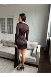 Платье из плотного атласа, с акцентным элементом в виде шлейфа сбоку изделия. Рост модели 168 см. Длина-86 см, рукав-62 см,обхват груди-86 см,обхват талии-76 см,обхват бедер-96 см.