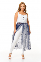 Удобный комплект для летних прогулок: сарафан с кружевной прозрачной юбкой и нижняя юбка из хлопка. Летящее платье-сарафан из легкой комбинированной ткани для жаркого лета. Лиф из непрозрачной белой ткани с застежкой по переду на петли и пуговицы. Бретели регулируются по длине. Кружевная юбка свободная, низ ажурный. Нижняя юбка из тонкого хлопка крой-«клешь», пояс на резинке. Длина лифа по боковому от проймы до юбки 18 см см. Длина кружевной юбки от талии 75 см. Окружность по груди размер 44-88 см 46-92 см 48-96 см 50-100 см 52-104 см Окружность по талии размер 44- 74см 46- 78 см 48- 82 см 50- 86 см 52- 90 см Длина нижней юбки 57 см