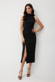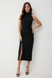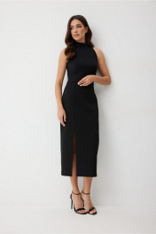 Трикотажное платье которое легко переходит из повседневной жизни в нарядный вечерний образ. Платье прилегающего силуэта, отрезное по линии талии. Выполнено из плотной, хорошо тянущейся трикотажной ткани, которая обеспечивает идеальную посадку по фигуре. Воротник-стойка и американская пройма без рукавов визуально вытягивают силуэт. По переду юбки платья на правой части расположен шов, переходящий в разрез. По спинке застежка на потайную молнию вверху среднего шва. Это платье идеально сочетается с жакетом для работы или яркими аксессуарами для праздника. Промеры в 44 размере: длина по спинке - 123 см длина до талии - 38 см ПОГ - 43 см ПОТ - 35 см ПОБ - 47 см