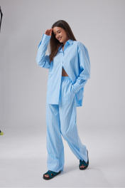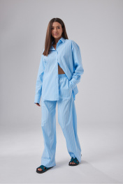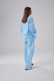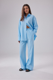 Брюки свободного кроя выполнены из полотна голубого цвета в полоску. Пояс на эластичной резинке шириной 4 см, имитация застежки, широкоя подгибка низа. Длина изделия по боковому шву 114 см, длина изделия по внутреннему шву 86 см.