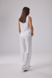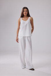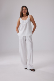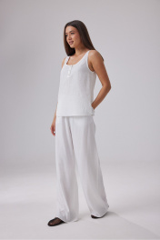 Брюки женские свободного кроя, выполнены из струящегося белого полотна с эффектом мятости. Пояс на эластичной резинке шириной 2 см. Длина изделия по боковому шву 116 см.