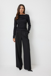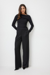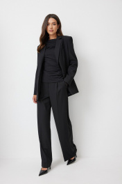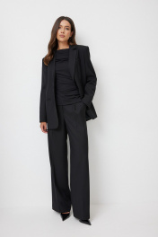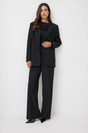 Брюки женские, прямые, с высокой посадкой. Выполнены из костюмной ткани. В боковых подрезах по переду функциональные карманы. Пояс притачной со шлевками, застегивается на потайной крючок. Застежка на тесьму-молнию. По переднему полотнищу встречные складки. Длина брюк по боковому шву с поясом 113 см. Брюки составят стильный образ с жакетом М660.