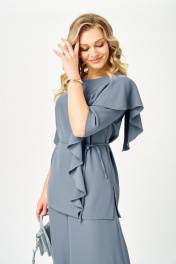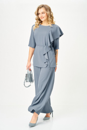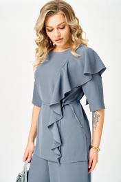 Комплект женский брючный 2-х предметный, состоит из блузы и брюк. Блуза прямого силуэта свободного покроя. Спинка цельная, по середине горловины разрез-капля с застежкой на петлю и пуговицу. По переду с левой стороны вертикальный рельеф с отделочной деталью в виде волана. Нагрудные вытачки из бокового шва. В боковых швах разрезы. Рукав втачной 3/4 одношовный. Горловина округлой формы, обработана обтачкой. В комплекте съемный пояс из основной ткани. Брюки-палаццо, расширенные к низу, с центральной застежкой гульфик на молнию и пуговицу. В боковых швах карманы. Пояс притачной с резинкой по спинке.