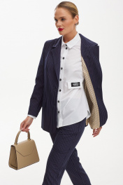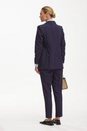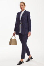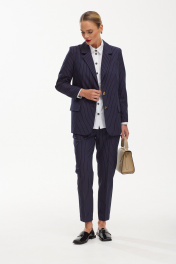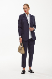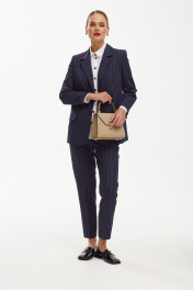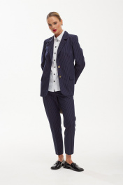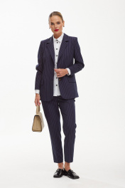 Офисный брючный костюм – это воплощение элегантности и стиля, которые идеально подходят для современной и уверенной в себе женщины. Модель идеально сидит на больших размерах. Полоска визуально вытягивает силуэт, а богатый темно-синий цвет подчеркнет Вашу элегантность. Этот образ призван подчеркнуть фигуру и придать обладательнице утонченность, сохраняя при этом комфорт и свободу движения. Данный комплект сшит из высококачественной ткани темно-синего цвета, в полоску. Жакет удлиненный, прямого кроя, прикрывающий линию бедра. Он отлично корректирует фигуру, зрительно добавляя рост и грациозность внешнему виду. Брюки классического фасона, с завышенной талией. Сзади для удобства и комфорта вставлена резинка. Данная модель будет отлично сочетаться с обувью на каблуке, делая образ элегантным. Для более формальных мероприятии и повседневных образов можно сочетать с более комфортной обувью, без каблука. Данный жакет можно носить с поясом. Таким образом можно создать приталенный силуэт при помощи ремня, возможно даже не застегивая при этом жакет. Ремень прекрасно акцентирует на себе внимание, делая образ более нарятным. Женский брючный костюм просто обязан быть в гардеробе любой модницы. Это поистине универсальный предмет гардероба, который можно носить в комплекте, а также сочетать и с другими элементами вашего гардероба. Например, данная модель жакета отлично смотрится в сочетании с джинсами. Образ получается живым и современным. Неожиданным, но очень современным считается сочетание классической футболки и данного костюма. Вырез майки не должен быть слишком глубоким. Подойдут круглый или в форме лодочки. Образ будет выглядеть оригинально и необычно. Для более классического варианта подойдет рубашка или блузка, желательно белого цвета. Оригинально смотрится в сочетании с легким джемпером или жилетом. Эта базовая модель костюма позволит создать не только теплый, но и сложный стильный образ.
