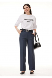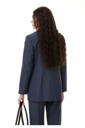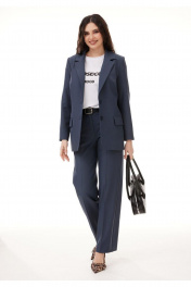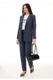 Костюм 3-х предметный, состоящий из жакета, брюк и футболки. Жакет и брюки выполнены из костюмной поливискозы, футболка выполнена из хлопкового трикотажа. Жакет выполнен на контрастной подкладке из поливискозы. Жакет прямого силуэта с намеком на полуприлегание, с застежкой на две петли-пуговицы. Горловина оформлена воротником пиджачного типа, рукава двушовные втачные. Спинка жакета со средним швом. Перед жакета с рельефами, нагрудными вытачками и прорезными карманами с клапаном. Длина жакета - до середины бедра. Брюки классической формы, прямого силуэта, со стрелками по передним и задним половинкам. Верхний срез обработан обтачным поясом. На задних половинках расположны талевые вытачки, и настрочены декоративные листочки. В боковых швах брюк обработаны наклонные карманы. Застёжка центральная на тесьму молнию и крючок. В комплект входит съёмный ремень. Футболка прямого силуэта, с втачным рукавом с цельнокроеной манжетой. Горловина обработана обтачкой.