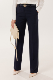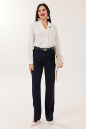 Брюки классической формы, прямого силуэта, со стрелками по передним и задним половинкам. Верхний срез обработан обтачным поясом, дополнен практичными шлевками для ремня. На задних половинках расположены талиевые вытачки с настрочными декоративными листочками. В боковых швах брюк обработаны наклонные карманы. Застёжка центральная на тесьму-молнию и крючок. Брюки комплектуются ремнем. Выбирая эти брюки, Вы можете быть уверены, что создадите множество удачных стилизаций. Независимо от того, наденете ли вы их в офис, на семейное торжество или на свидание, идеально сшитые женские длинные брюки – хороший выбор.