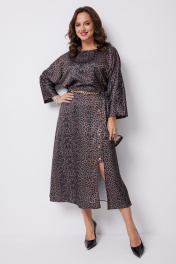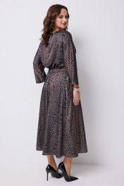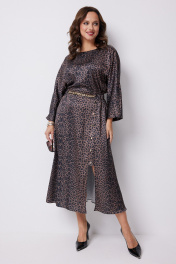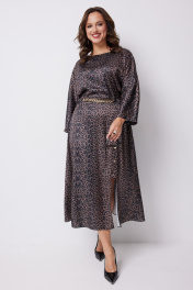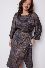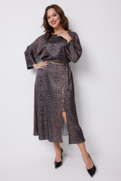 Стильное платье А-силуэта, выполненное из вискозы с оригинальным принтом. Платье отрезное по линии талии. Верхняя часть переда платья с круглой горловиной, спинка - со средним швом и капелькой, застегивающейся на навесную петлю и пуговицу. Рукав цельнокроенный, длиной 7/8. Нижняя часть платья покроя полусолнце. На одной из сторон юбки переда обработана отделочная планка с декоративными пуговицами, внизу - разрез. В боковых швах в области бедер обработаны карманы. В центральной части переда в области талии - притачной пояс со съемной декоративной цепью, которая изящно подчеркивает линию талии. По боковым швам и спинке пояса вставлена широкая резинка. Это нарядное женское платье идеально подходит для торжественных мероприятий, романтических прогулок, новогодних корпоративов и юбилеев, подчеркивает индивидуальность и стиль.