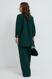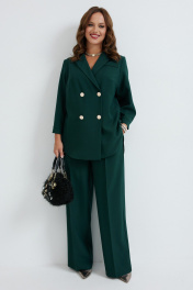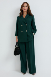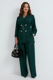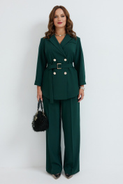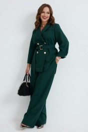 Костюм состоит из жакета и брюк. Качественная поливискоза, из которой выполнена модель, обеспечит долговечность изделию и приятные ощущения его обладательнице. Жакет без подкладки прямого силуэта, с двубортной застежкой на петли-пуговицы, длиной до середины бедра. Перед жакета с нагрудными вытачками, в области груди расположена декоративная листочка. Спинка с двойной кокеткой, в шве притачивания которой обработана встречная складка. Низ жакета фигурный, с закруглениями по боковым швам. Рукава двушовные, длиной 3/4, по низу с манжетой, застегивающейся на петлю и пуговицу. Горловина оформлена воротником пиджачного типа. Брюки классической формы, прямые от линии бедер, со стрелками по передним и задним половинкам. Верхний срез обработан поясом, в который от бокового шва вставлена резинка по задним половинкам. В боковых швах обработаны наклонные карманы. На задних половинках расположены талиевые вытачки. В комплект входит пояс из основной ткани.