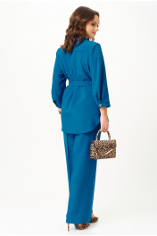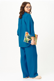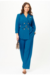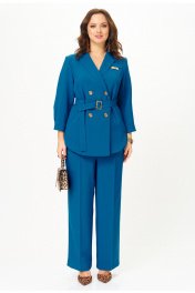 Костюм состоит из жакета и брюк. Качественная поливискоза, из которой выполнена модель, обеспечит долговечность изделию и приятные ощущения его обладательнице. Жакет без подкладки прямого силуэта, с двубортной застежкой на петли-пуговицы, длиной до середины бедра. Перед жакета с нагрудными вытачками, в области груди расположена декоративная листочка. Спинка с двойной кокеткой, в шве притачивания которой обработана встречная складка. Низ жакета фигурный, с закруглениями по боковым швам. Рукава двушовные, длиной 3/4, по низу с манжетой, застегивающейся на петлю и пуговицу. Горловина оформлена воротником пиджачного типа. Брюки классической формы, прямые от линии бедер, со стрелками по передним и задним половинкам. Верхний срез обработан поясом, в который от бокового шва вставлена резинка по задним половинкам. В боковых швах обработаны наклонные карманы. На задних половинках расположены талиевые вытачки. В комплект входит пояс из основной ткани.