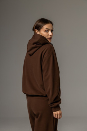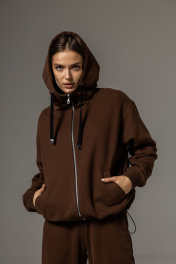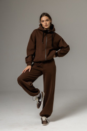 Костюм ( Бомбер с высокой горловиной и капюшоном + брюки палаццо с фиксатором) выполнен из премиального турецкого футера с велюровым напылением, классического шоколадного цвета, который, благодаря велюровому напылению выглядит, как замша.Он отлично держит форму и обладает исключительными теплорегуляторными функциями. Бомбер с капюшоном на металлической молнии, внизу втянута резинка фиксатор, позволяющая затягивать низ бомбера либо оставлять свободно ниспадающим.Прорезные карманы на передней планке с обеих сторон декорированы широкой диагональной листочкой.Длина бомбера от плеча для размера S и М -60 см, для размера L - 66 cм. Длина рукава от горловины 72 см. Брюки палаццо с фиксатором позволяют носить брюки как прямыми, так и затянутыми на резинку-фиксато,особенно хорошо это в дождливую погоду, так как зафиксирорвав брюки, вы не дадите им загрязниться и вымочиться.Хлопковый шнур в поясе позволяет формировать оъем талии по мере необходимости. Абсолютно универсальное изделие для любого гардероба и стиля. Не образуются катышки на лицевой стороне изделия, цвет зделия остается ярким и насыщенным даже после 50 стирок. Уход за изделием: деликатная стирка с жидким моющим средством при температуре 30-40 градусов. При стирке использовать мягкие моющие средства. не применять отбеливающие средства.