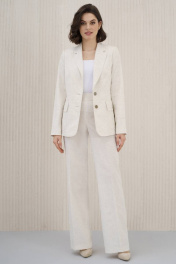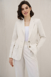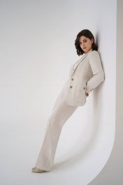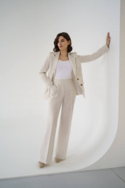 Льняной брючный костюм – настоящее спасение для работающих женщин в жаркое время года. Костюм женский классический, состоит из жакета полуприлегающего силуэта и брюк, предназначен для повседневной носки. Жакет с центральной бортовой застёжкой на 2 петли и пуговицы. Перед жакета с двумя парами рельефов, идущих из проймы до низа и талевой вытачкой идущей от кармана. Ниже уровня линии талии обработан прорезной карман с клапаном фигурной формы и двумя обтачками. Низ борта переда закруглённый. Спинка со средним швом и двумя парами рельефов, идущих из проймы до низа. Рукава втачные, двухшовные, длинные. Воротник пиджачного типа, концы воротника острые. Жакет на подкладке с плечевыми накладками. Брюки со стрелками, длиной ⅞ длинные. Верхний край брюк обработан притачным поясом-обтачкой, в боковых швах обработаны карманы с наклонной линией входа. На задних половинках брюк талевые вытачки. Спереди обработана застежка на тесьму-молнию с гульфиком и откоском. Пояс застёгивается на петлю и пуговицу. Длина жакета по среднему шву спинки - 64,0 см (±3,0 см), Длина рукава жакета- 62,0 см (±2,0 см). Длина брюк с поясом - 111,0 см (±3,0 см), Ширина пояса - 5,0 см. Тип ткани: костюмно-плательная. Состав: полиэстер - 39%, вискоза - 32%, лен - 29%. Состав подкладки: хлопок - 100%.