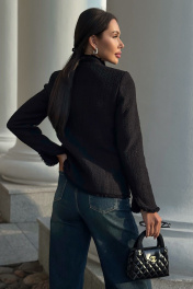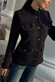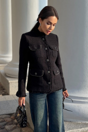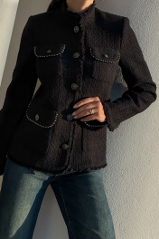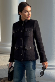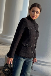 Этот жакет в стиле Шанель выполнен из черного твида, что придает ему особый шарм и элегантность. Красивая отделка и фурнитура дополняют образ, делая его еще более изысканным. Жакет идеально подойдет для создания строгого, но в то же время женственного образа. Он прекрасно сочетается с платьями и юбками, а также с джинсами и брюками. Благодаря качественным материалам и мастерству исполнения, жакет сохранит свою форму и внешний вид на долгое время. В этом жакете вы будете выглядеть стильно и уверенно в любой ситуации. Жакет женский полуприлегающего силуэта на подкладке, нарядный. Жакет с центральной бортовой застежкой на 5 петель и пуговиц (фурнитура может незначительно отличаться от фото). Перед с отрезным бочком и талиевой вытачкой. На переде расположены 2 пары накладных карманов с клапаном, по низу карманы немного больше, карманов расположенных на уровне груди. Карманы, клапаны и низ борта закругленной формы. По краю клапанов идет декоративная отделочная тесьма, карманы застегиваются на петлю и пуговицу. Спинка со средним швом и отрезными бочками. Рукава втачные двухшовные длинные по низу локтевого шва обработан разрез с закругленными краями. Плечевой пояс оформлен плечевыми накладками. Горловина обработана воротником стойкой. По низу рукавов, борту жакета, низу и стойке идет отделка бахромой. Средняя длина жакета - 60,5 см (±3,0 см), средняя длина рукава - 61,0 см (±3,0 см). Тип ткани: костюмно-плательная. " "42 размер Жакет Длина по среднему шву спинки – 60,0 см (±2,0 см), Длина рукава - 62,0 см (±1,0 см), Ширина рукава вверху - 16,5 см (±1,0 см), Ширина рукава по низу - 13,0 см (±0,5 см), Ширина на уровне глубины проймы - 47,0 см (±1,0 см), Ширина на уровне линии талии - 45,0 см (±1,0 см), Ширина на уровне линии бедер -50,5 см (±1,0 см), Длина плеча - 11,6 см (±1,0 см). 44 размер Жакет Длина по среднему шву спинки – 60,5 см (±2,0 см), Длина рукава - 62,0 см (±1,0 см), Ширина рукава вверху - 17,5 см (±1,0 см), Ширина рукава по низу - 13,2 см (±0,5 см), Ширина на уровне глубины проймы - 49,0 см (±1,0 см), Ширина на уровне линии талии - 47,0 см (±1,0 см), Ширина на уровне линии бедер - 52,0 см (±1,0 см), Длина плеча - 11,7 см (±1,0 см). 46 размер Жакет Длина по среднему шву спинки – см (±2,0 см), Длина рукава - см (±1,0 см), Ширина рукава вверху - см (±1,0 см), Ширина рукава по низу - см (±0,5 см), Ширина на уровне глубины проймы - см (±1,0 см), Ширина на уровне линии талии - см (±1,0 см), Ширина на уровне линии бедер - см (±1,0 см), Длина плеча - см (±1,0 см). 48 размер Жакет Длина по среднему шву спинки – см (±2,0 см), Длина рукава - см (±1,0 см), Ширина рукава вверху - см (±1,0 см), Ширина рукава по низу - см (±0,5 см), Ширина на уровне глубины проймы - см (±1,0 см), Ширина на уровне линии талии - см (±1,0 см), Ширина на уровне линии бедер - см (±1,0 см), Длина плеча - см (±1,0 см). 50 размер Жакет Длина по среднему шву спинки – см (±2,0 см), Длина рукава - см (±1,0 см), Ширина рукава вверху - см (±1,0 см), Ширина рукава по низу - см (±0,5 см), Ширина на уровне глубины проймы - см (±1,0 см), Ширина на уровне линии талии - см (±1,0 см), Ширина на уровне линии бедер - см (±1,0 см), Длина плеча - см (±1,0 см). 52 размер Жакет Длина по среднему шву спинки – см (±2,0 см), Длина рукава - см (±1,0 см), Ширина рукава вверху - см (±1,0 см), Ширина рукава по низу - см (±0,5 см), Ширина на уровне глубины проймы - см (±1,0 см), Ширина на уровне линии талии - см (±1,0 см), Ширина на уровне линии бедер - см (±1,0 см), Длина плеча - см (±1,0 см). "