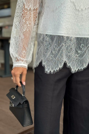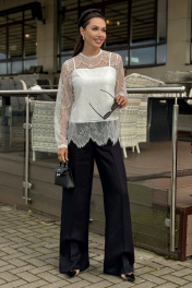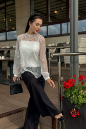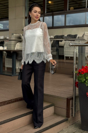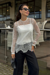 Элегантная блузка женская нарядная из тонкого гипюра в белом цвете – идеальный выбор для особых случаев. Нежный кружевной рисунок и женственный крой создают утончённый образ, который подчеркнёт вашу красоту и стиль. Блуза женская многослойная предназначена как для нарядной, так и для повседневной носки. Верхний слой блузы полуприлегающего силуэта, выполнен из гипюровой ткани. Перед и спинка цельные, без вытачек. Спинка от горловины с застежкой на 1 навесную петлю и пуговицу (размер и цвет фурнитуры может незначительно отличаться от фото). Низа переда и спинки с фестонами. Горловина круглая, с отделочной кружевной тесьмой. Рукава втачные, одношовные, длинные, понизу со сборкой и с отделочной кружевной тесьмой. Нижний слой блузы полуприлегающего силуэта двухслойная, на регулируемых бретелях, с нагрудными вытачками, выходящими из боковых швов, из блузочной ткани.