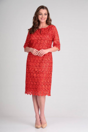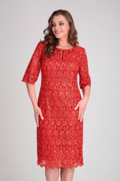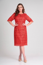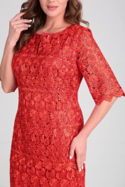 Нарядное платье полуприлегающего силуэта. Выполнено из двух видов ткани. Верх платья кружевной, нижнее выполнено из атласной ткани. Платье без подкладки и без плечевых накладок. Вырез горловину круглый с декоративным разрезом. Рукав 3/4. По низу платья и рукава фестоны. По среднему шву спинки разрез. Потайная молния в боковом шве. Длина платья по спинке 104 см